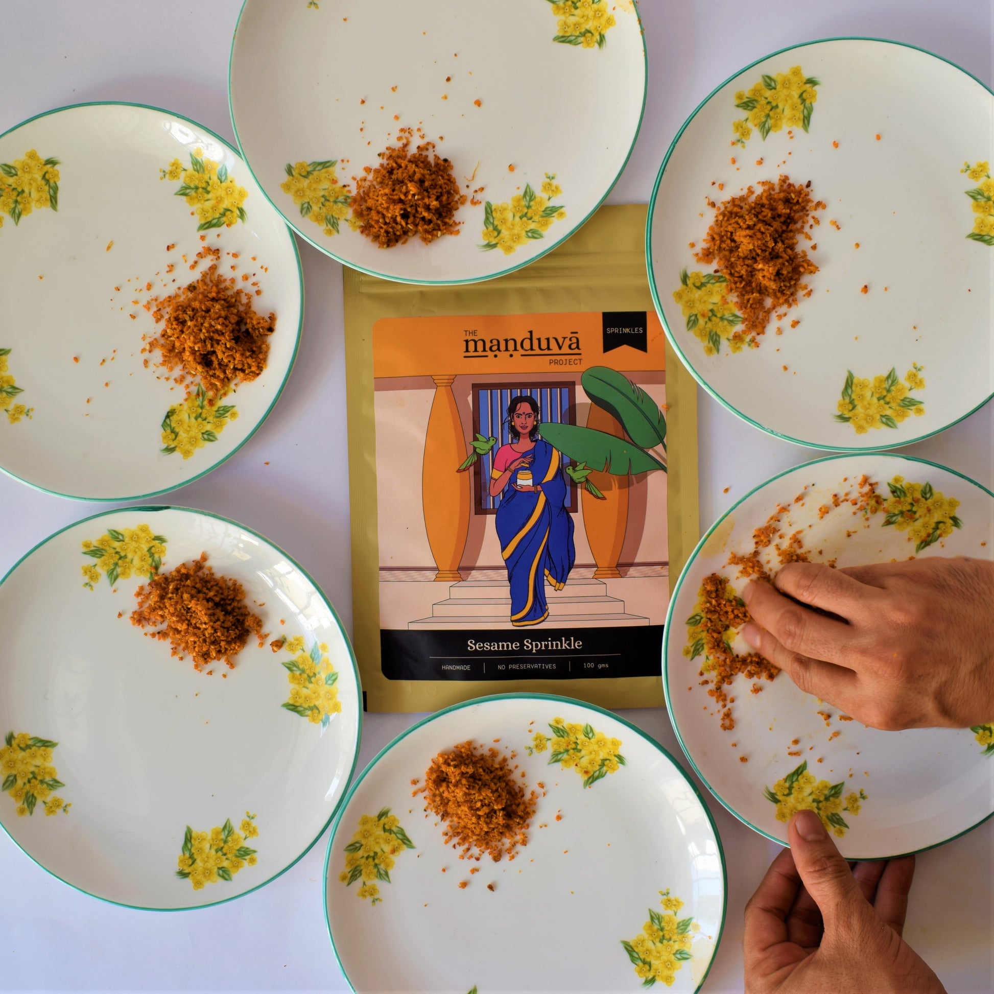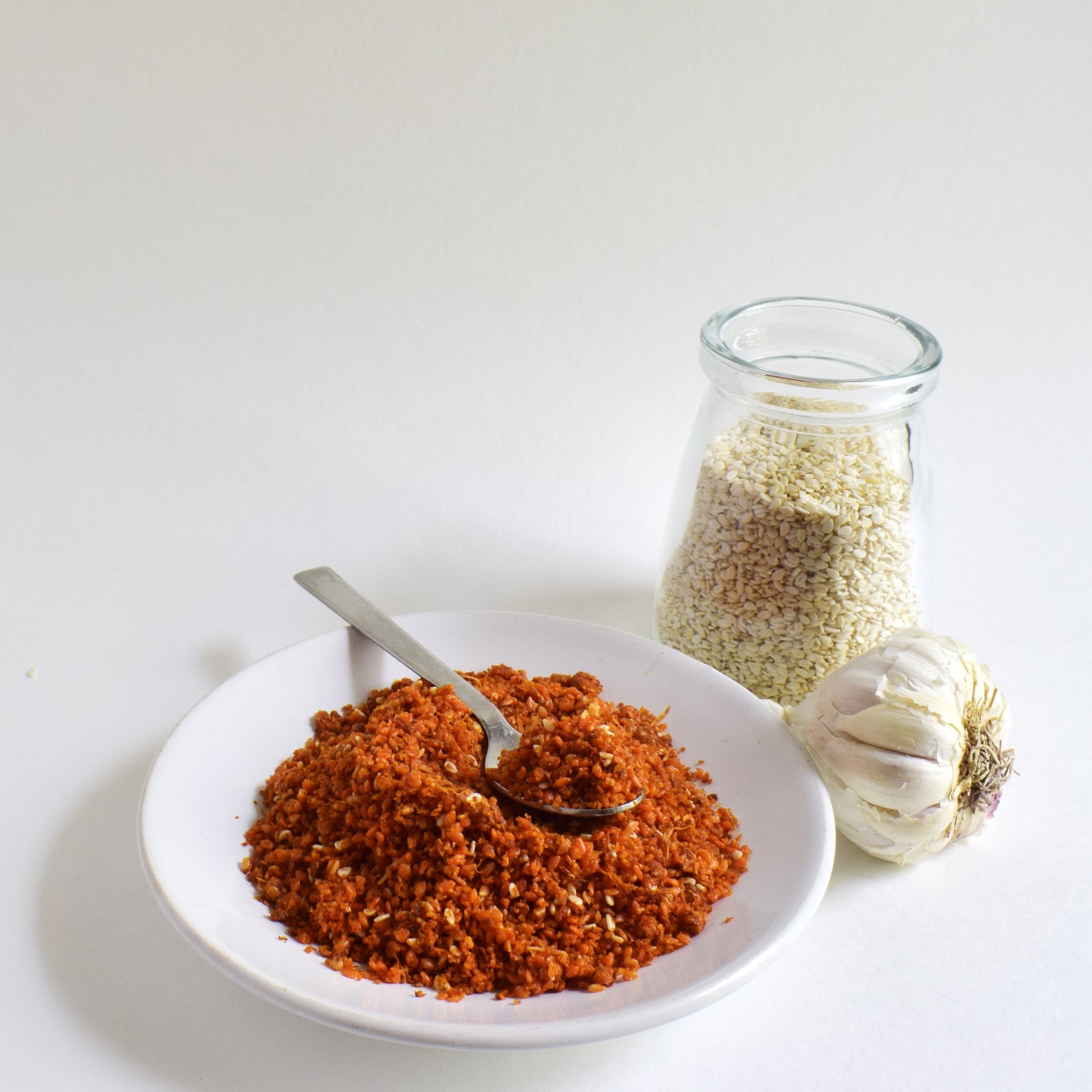 Sesame Sprinkle is a bold, flavorful blend made with roasted sesame seeds, dry coconut, garlic, dry red chilli, jeera, and a touch of salt — all hand-pounded to perfection. This traditional South Indian-style podi offers a nutty, spicy, and aromatic punch that elevates any meal.